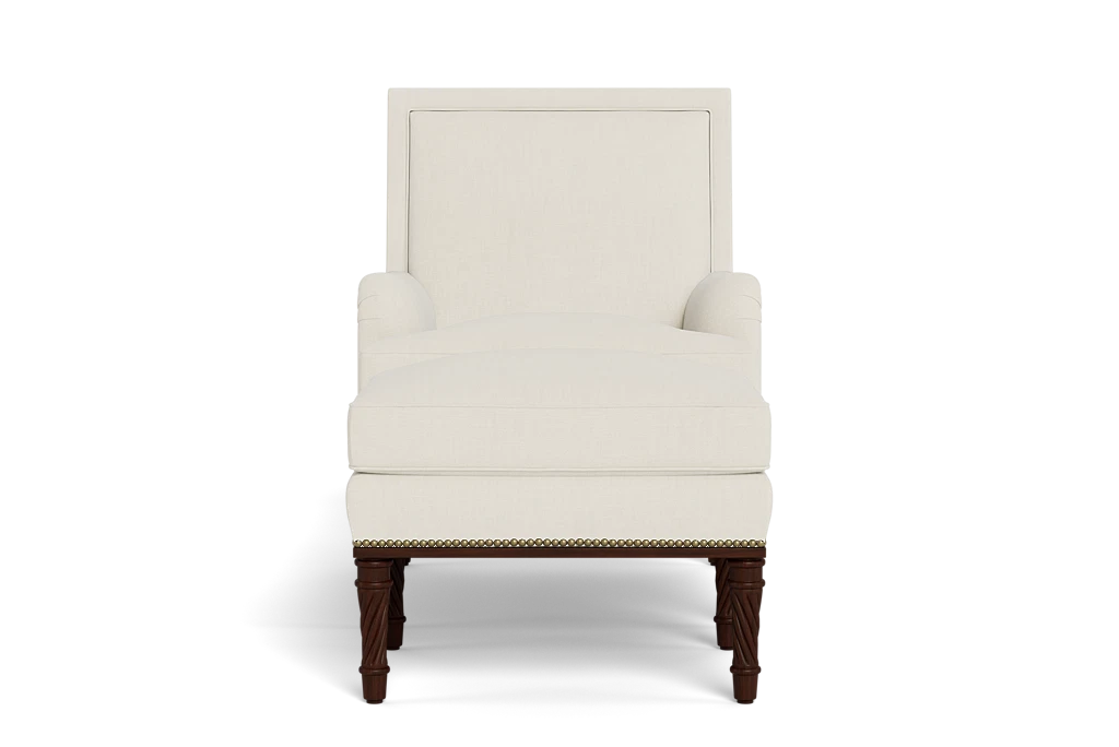 Inspired by the famous Jean-Henri Jansen, a designer known for his exceptional taste and for his work renovating and redecorating the White House, the Azure chair and matching ottoman brings traditional ornate flourishes into current times. Our modern chair boasts rolled arms, carved twisted legs and a stylish French nailhead trim. Perfect to tuck into a peaceful bedroom corner.