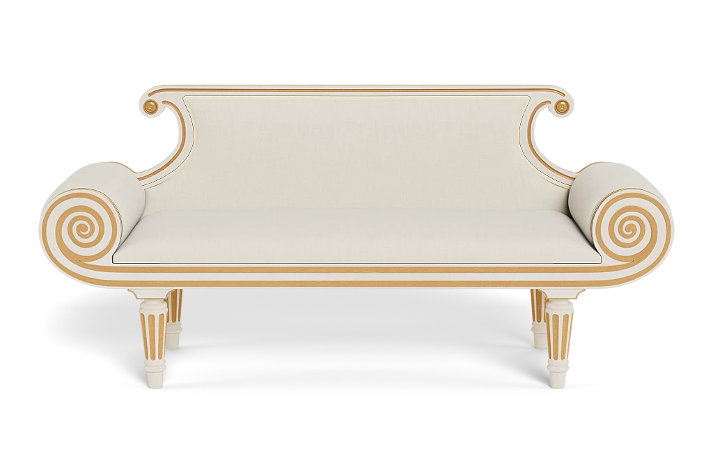 A Regency style bench with playful scrolled arms, it is perfectly sized for hallways or placing at the end of a bed.