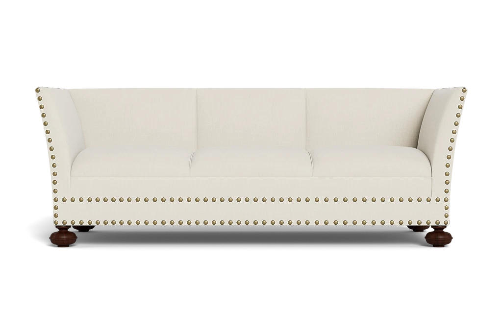 A generously proportioned sofa with high back and sides to help ward off drafts, the classic 17th century Knole settee was originally created for monarchs to use when welcoming important guests. While thoroughly modern with its wide bun feet and over-sized nailheads, our version is just as inviting and most likely more comfortable.