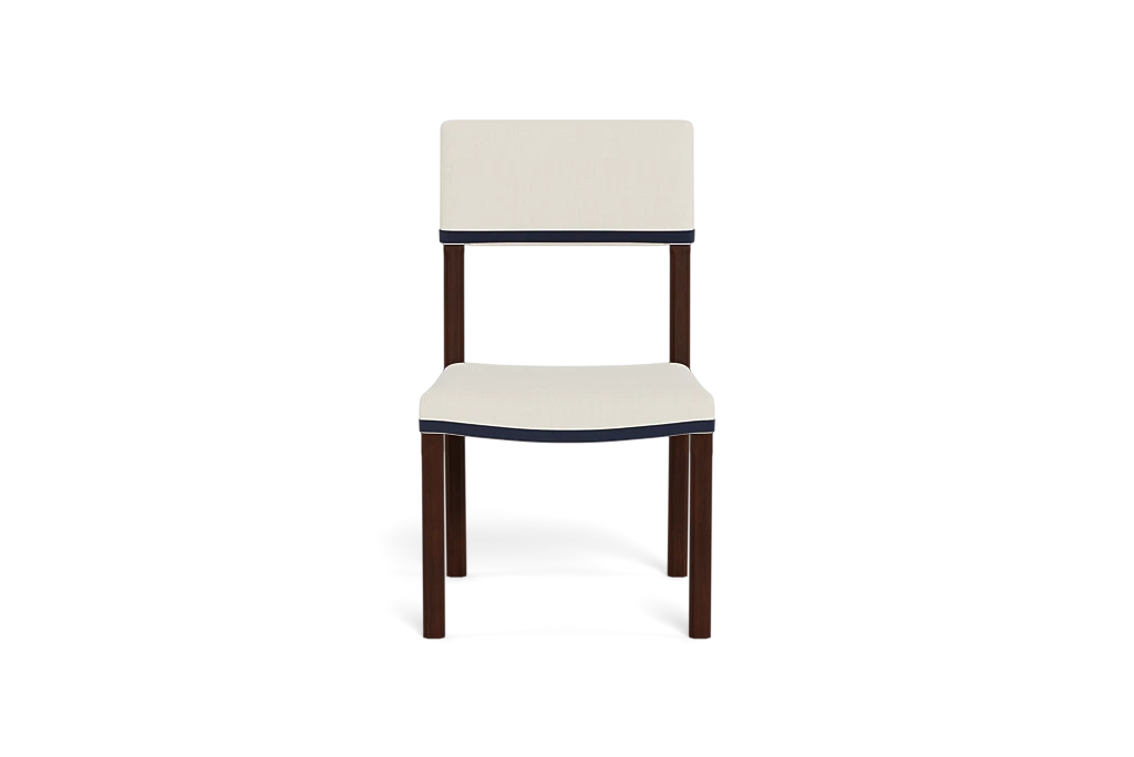 Perfect for dining or pulled up to a desk, with a comfortable saddle seat and chamfered legs. Finished with beautiful navy ribbon trim on both the bottom of the back and seat. Available in four wood finishes.
