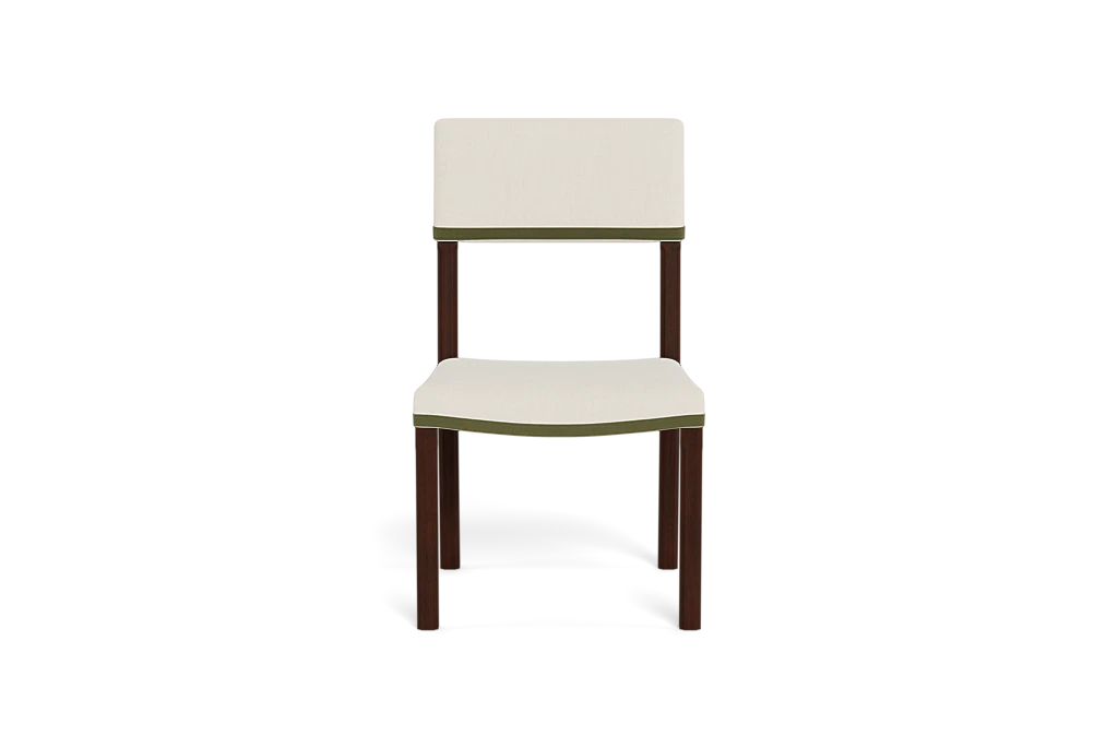 Perfect for dining or pulled up to a desk, with a comfortable saddle seat and chamfered legs. Finished with beautiful olive ribbon trim on both the bottom of the back and seat. Available in four wood finishes.