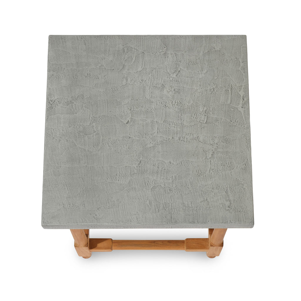 Designed with both practicality and elegance in mind, our Outdoor Vita Side Table features a natural, unsealed teak base with turned legs that will gracefully weather over time, blending seamlessly into its natural surroundings. The durable, outdoor-safe top mimics the texture of concrete, providing the perfect surface for a potted succulent or a tall glass of iced tea on the terrace. A sister to our Outdoor Potting Table, this piece is scaled to sit with our Crofter’s Lounge Chair & Sofa.
