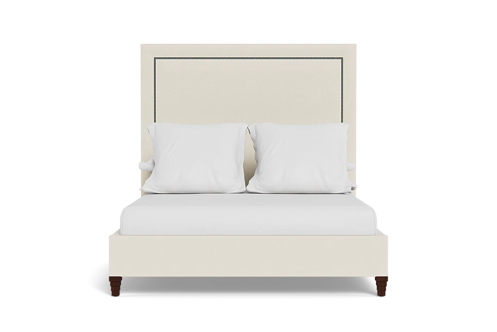 Beautiful nailheads punctuate the easy rectangular shape of our Sophie bed, making it a stylish centerpiece to any bedroom. Fully upholstered with a winter pine grosgrain trim and sophisticated stepped legs, this bed is a sumptuous getaway right in your own home.
